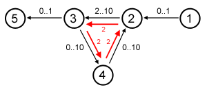 There are 5 stations, 5 cables and each cable has minimum required power and maximum capacity Li..Ci (e.g., 2..10 means Li=2 and Ci=10) as shown in Figure 1. The red arrow (2-3-4-2) corresponds to the transmitted electricity power of 2. As you might have noticed, these power do not come from the power plant (station 1); however, the equilibrium constraint is maintained and all cables satisfy their minimum required power and maximum capacity. Therefore, the power transmission in Figure 1 is a valid one.